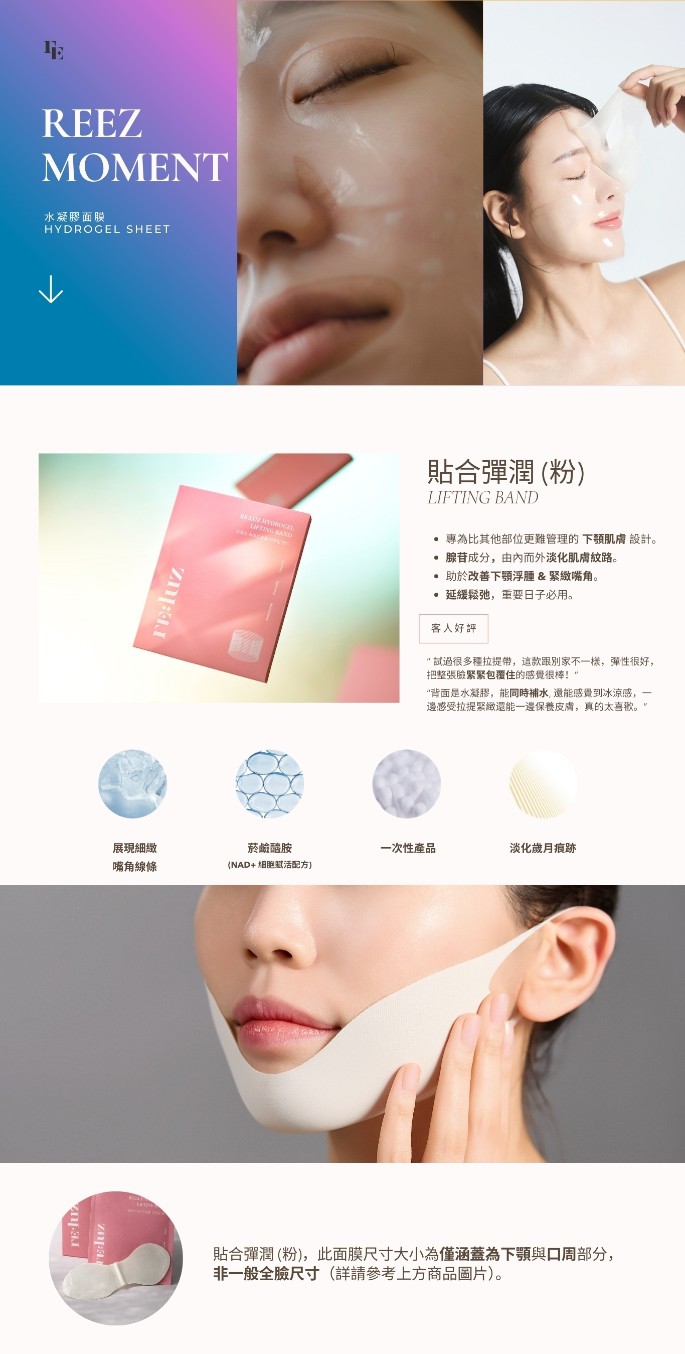 專為緊緻輪廓線條設計,利用高彈力水凝膠材質提供物理性拉提,緊密包覆下顎與口周線條。